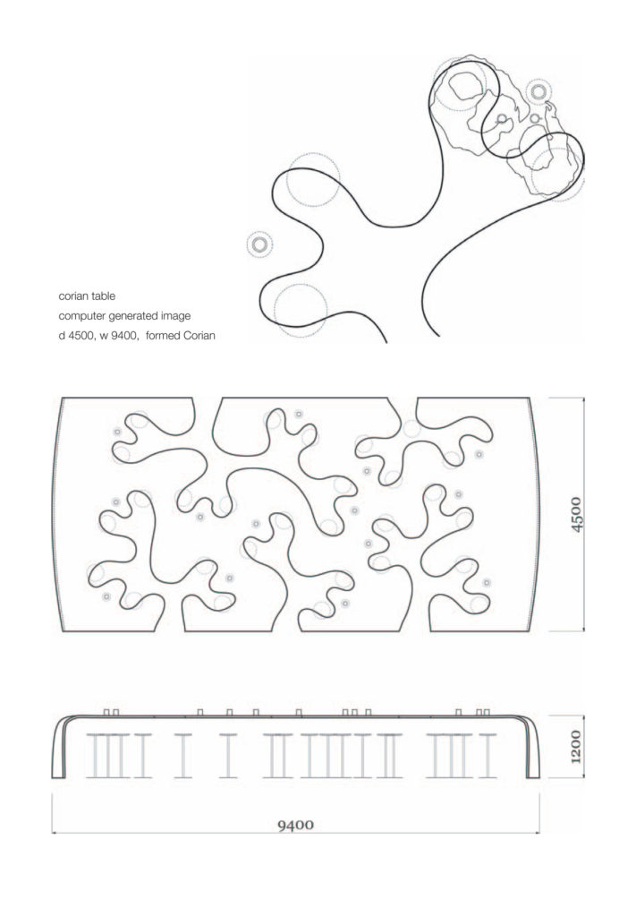 デュポンコーリアンで出来た大きなテーブルはまるで虫に食われた葉っぱのようなかたちでお客さんを内包します。お客さんは自分たちのお気に入りの場所を探すようにテーブルの中を散策するのです。