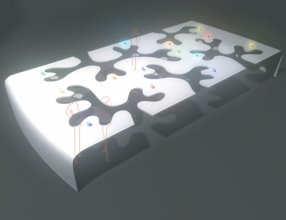The giant table can hold customers internally. They walk through pathways to find right place to sit. Corian has been one of the best material for a tabletop. Table lamps are integrated within table top.