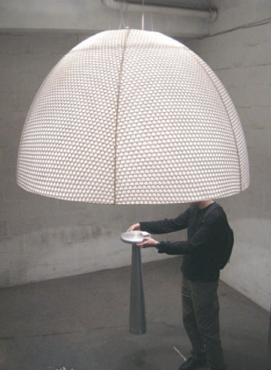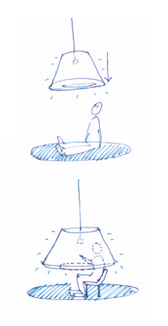 Inspired by Gulliver’s travel, this project explores new ways to give people hidden space, which achieve a psychological as well as physical separation from environment. The height adjustable lampshade creates secured private space internally. By pulling up a small table, also as a counter-weight, the shade descends and transform the scene under lampshade.