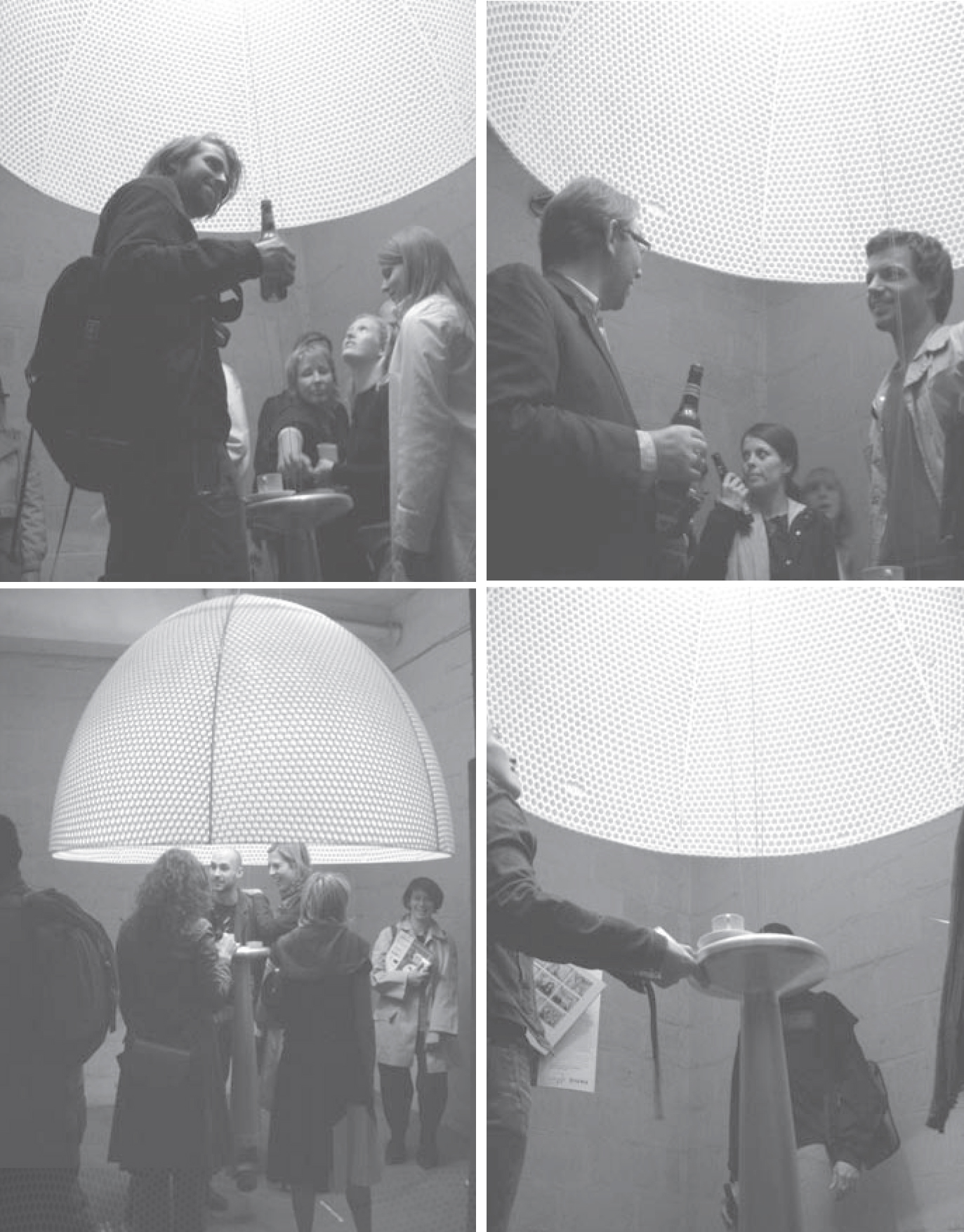 このランプシェードは下に下げればプライベートな個室空間となります。中央のテーブルはカウンターウェイトとなっているので、テーブルを操作することでシェードが上下します。プライバシーレベルをコントロールしたい場面での利用が可能です。