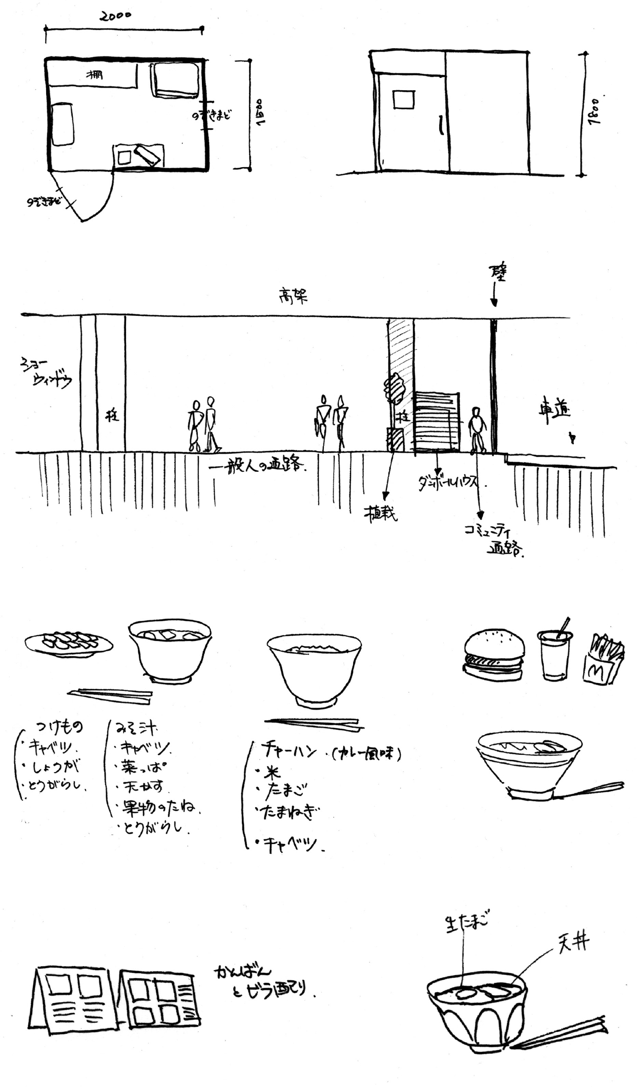2週間の間、新宿西口でホームレスの体験リサーチをしました。驚くほど暖かい段ボールハウス、立ち上がれる高さのある内部、二階のある段ボールハウス、施錠が出来る入り口の扉、疑似家族制度による共存体制、覗き窓などのディテールやダンボールハウス専門のホームレス建築家、食料調達の方法、ドブネズミによる深夜の攻撃、薬物中毒の隣人、面倒見のよいホームレスの親方など、大変貴重な経験をしました。