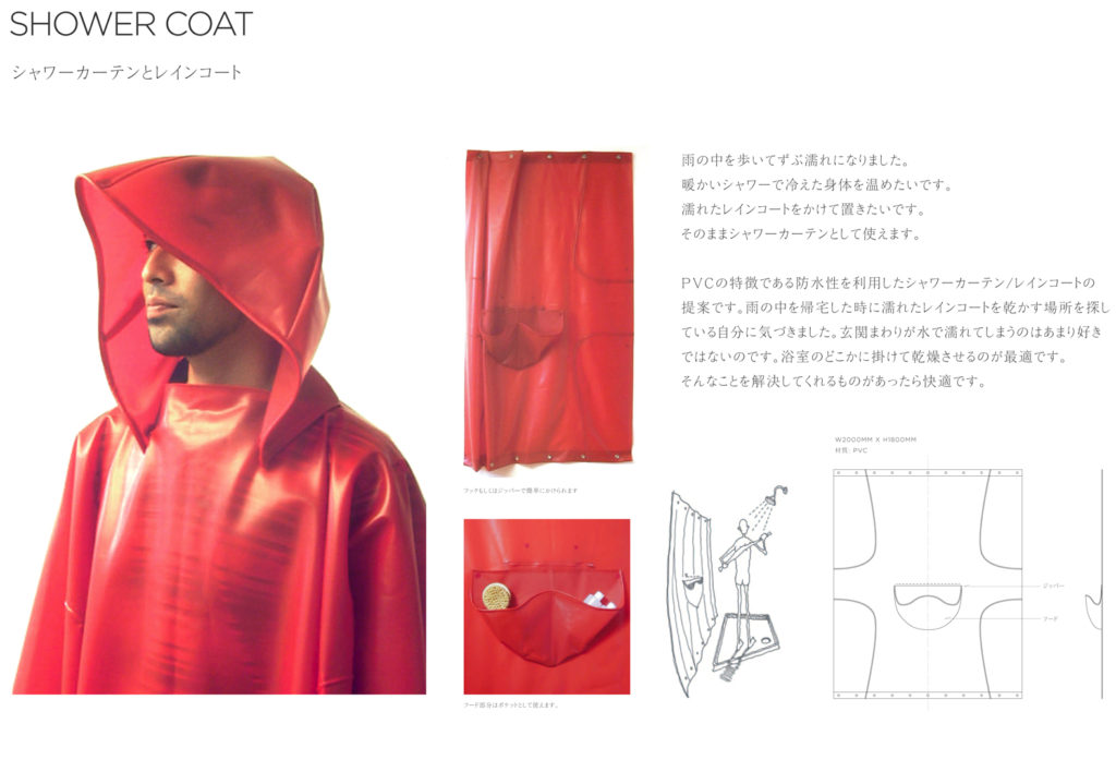 P V C の 特 徴 で あ る 防 水 性 を 利 用 し た シ ャ ワ ー カ ー テ ン / レ イン コ ート の 提 案 で す 。雨 の 中 を 帰 宅 し た 時 に 濡 れ た レ イ ン コ ー ト を 乾 か す 場 所 を 探 して い る 自 分 に 気 づ き ま し た 。玄 関 ま わ り が 水 で 濡 れ て し ま う の は あ ま り 好 き で は な い の で す 。浴 室 の ど こ か に 掛 け て 乾 燥 さ せ る の が 最 適 で す 。 そんなことを解 決してくれるものがあったら快 適です。