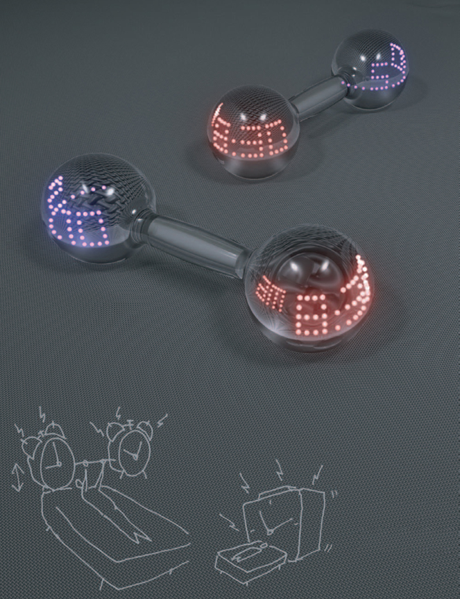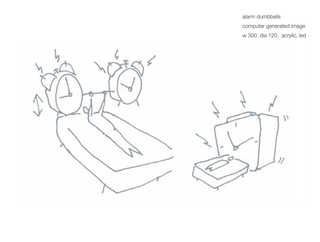 この目覚まし時計はダンベルのかたちになっています。目覚ましのベルを止めるにはあらかじめセットされた回数のエクササイズを完了する必要があります。たとえ寝ぼけていても運動が終わるまではベルが止まりません。